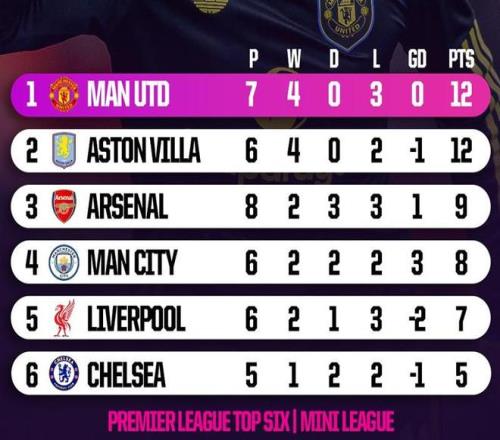 统计表明,英超积分榜前六名组成的小循环中,曼联7场得到12分,高居第一,阿森纳8场只有9分,强强对话的能力遭到质疑,阿斯顿维拉很不错,6场就拿到12分,是排名很高的重要因素。从另外一个角度看,曼联面对非前六名的球队,16场只得26分,场均只有1.63分,比强强对话的场均1.71分还要低。